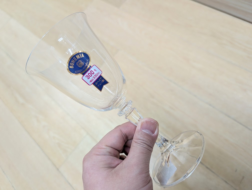 ダイソーのワイングラスの中で、私が最も衝撃を受けたのが、300円(税込330円)という価格帯で展開されているプレミアムなシリーズです。実はこの価格帯には、チェコの老舗メーカーである「クリスタルボヘミア社」製のグラスがあり、これはもはや100円ショップの枠組みを完全に超えたクオリティと言っても過言ではありません。