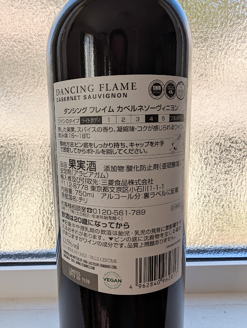 画像:実際にテイスティングした「ダンシングフレイム ダンシングフレイム カベルネ・ソーヴィニヨン2024」のボトル裏