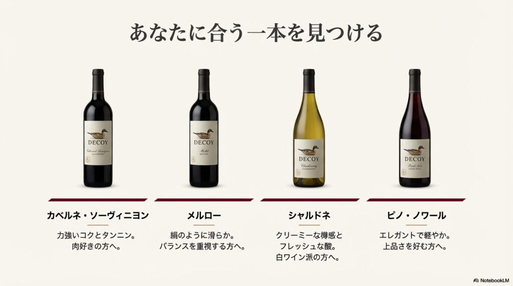 デコイには、ジンファンデル以外にも魅力的なラインナップが揃っています。それぞれの特徴を詳細にまとめてみました。自分の好みに合うのがどれか、想像しながら見てみてください。