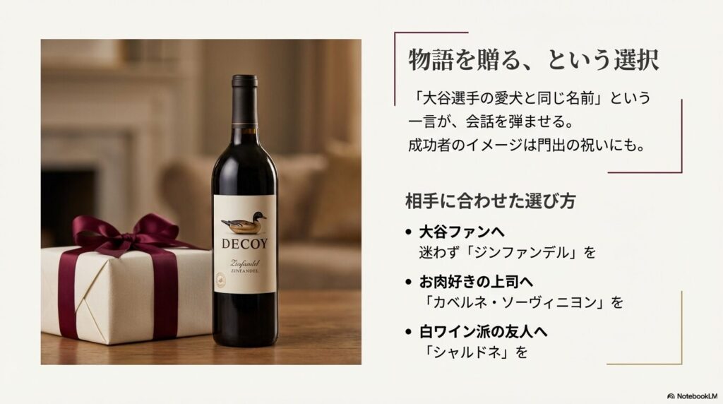 デコイのワインは、ギフトとしても非常に優秀です。「大谷選手の愛犬と同じ名前なんだよ」という一言を添えるだけで、会話が弾むこと間違いなしですからね。野球ファンの方へはもちろん、結婚祝いや退職祝いなど、新たな門出を祝うシーンにも「成功者のイメージ」と重なって喜ばれるはずです。