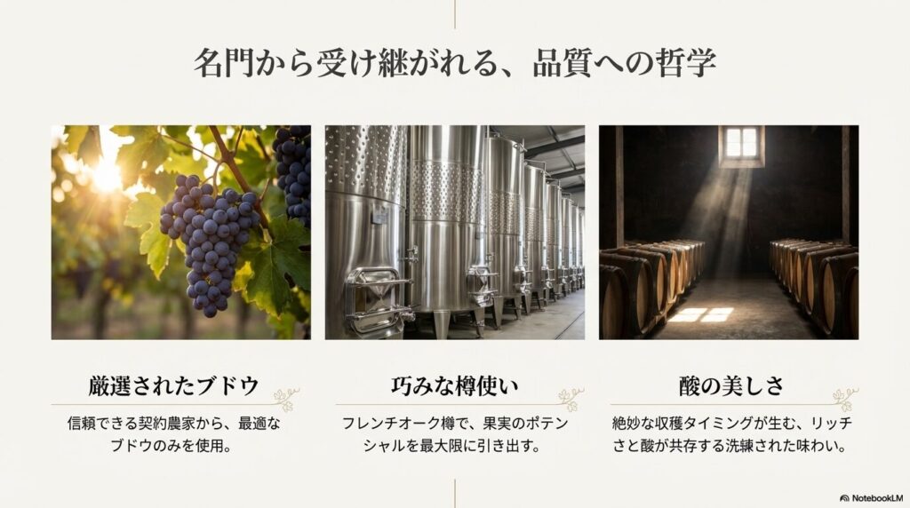 醸造においても、フレンチオーク樽を巧みに使い分け、果実本来のポテンシャルを最大限に引き出す手法が取られています。