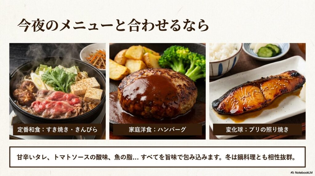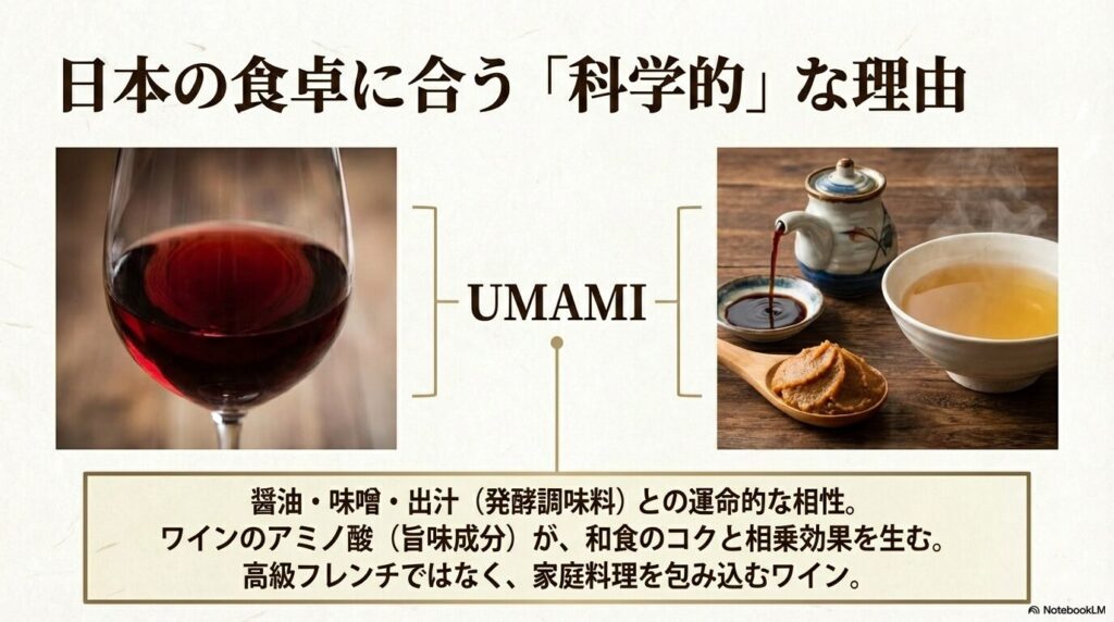 プロの料理人やソムリエが農民ロッソを絶賛する最大の理由は、その「ペアリング能力」の高さです。特に日本の食卓に欠かせない醤油・味噌・出汁との相性は、もはや科学的に見ても運命的と言えます。