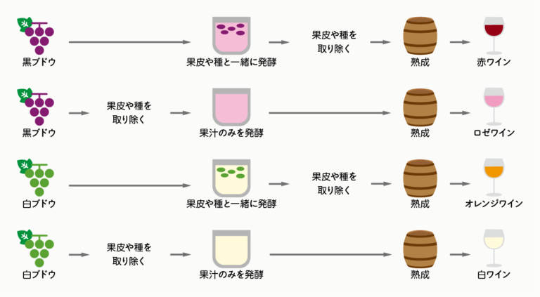 見た目が似ているため混同しがちですが、実は「どんなブドウを使っているか(黒ブドウか白ブドウか)」と、「どのくらい皮を一緒に漬け込んだか(果皮接触の長さ)」によって、ワインの種類が大きく変わります。