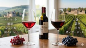 ワインを楽しむ際、舌や鼻だけでなく「目」で味わうことも非常に重要な要素です。グラスに注がれた瞬間の外観(色彩)を見るだけで、この二大品種は全く異なる個性を鮮烈に放ちます。